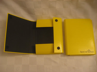 Die Kompetenzkarten zum Thema Dehnen und zusätzliche Beschreibungen befinden sich in Boxen aus Karton. Diese sind durch Kreppverschlüsse leicht zu öffnen und zu schließen. Die Ausmaße sind 20,5 x 25,5 x 4cm. Sie werden in verschiedenen Farben angeboten. Die unterschiedlichen Farben der Boxen dienen der favorisierten Farbauswahl der jeweiligen Sportfachkräften. Unabhängig der Farbwahl sind in den Boxen immer die selben Inhalte. Box blau